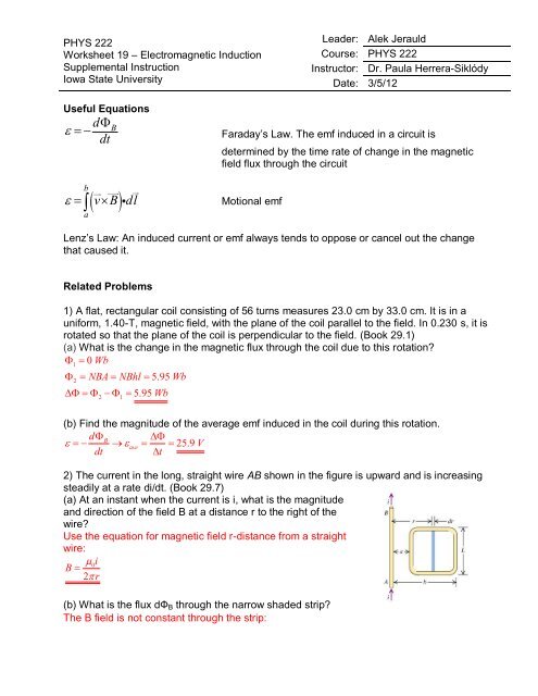 Phys 222 Worksheet 19 Electromagic Induction Answers